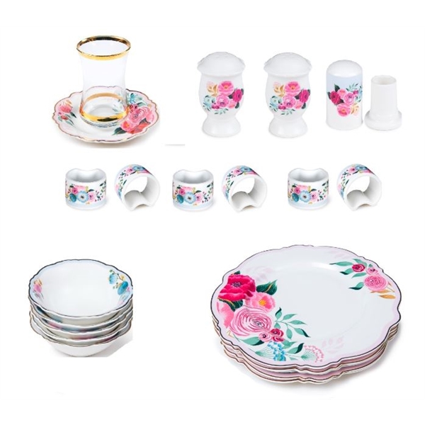 - 6 Düz servis tabağı; 6 Çay Bardağı ; 6 Çay Tabağı; 6 Kase; .6 Halka Peçetelik; 1 Tuzluk; 1 Biberlik; 1 Kapaklı Kürdanlık.