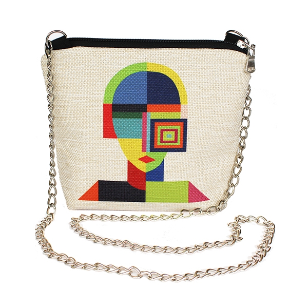 FR0441 Geometrik Kadın Baskılı Keten Kare Zincirli Çanta