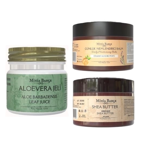 | - Set İçeriği; Shea Butter (100 ml), Aloe Vera Jel (75 ml), Günlük Nemlendirici Balm (30 ml) |