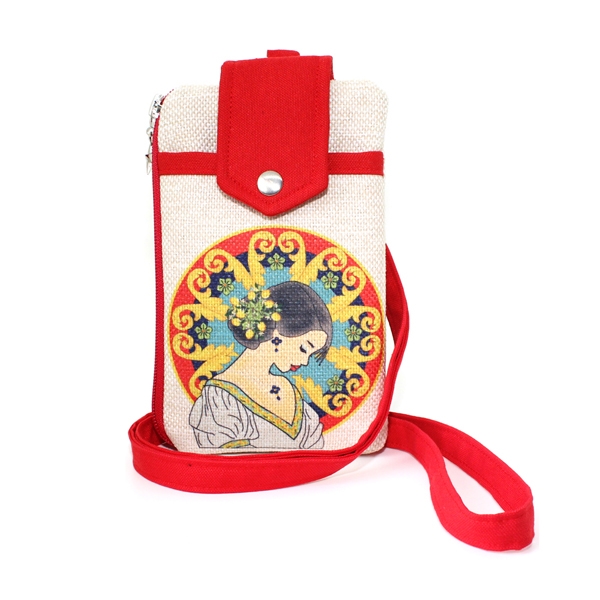 FR1826 Sicilyalı Kız Baskılı, Kırmızı Aparat, Keten Telefon Çantası