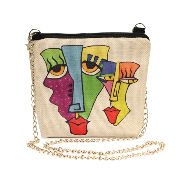 FR0425 İki Surat Baskılı Keten Kare Zincirli Çanta