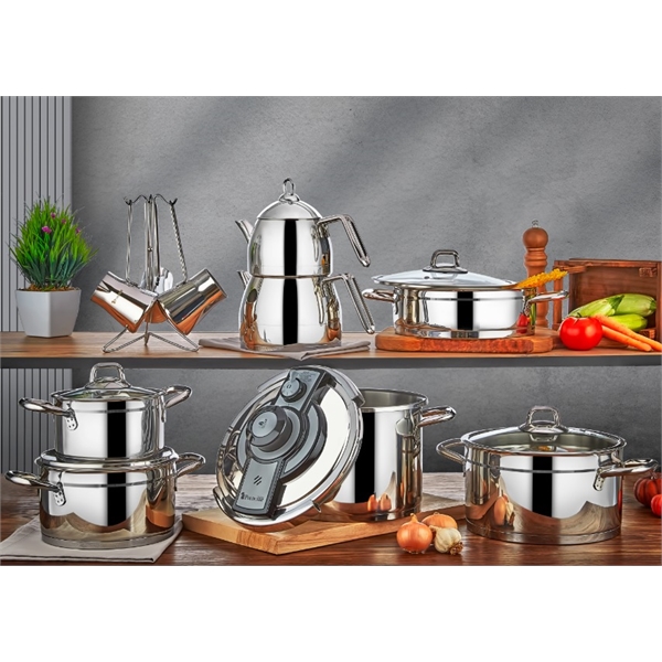 | - Ürün içeriği : 1 Adet Kapaklı 16 cm Derin Tencere, 1 Adet Kapaklı 20 cm Derin Tencere, 1 Adet Kapaklı 24 cm Derin Tencere, 1 Adet 24 cm Kapaklı Basık Tencere, 8 Lt Düdüklü Tencere, 4 Parça Orta Boy Çaydanlık Takımı, 4 Parça 3 lü Cezve Seti |