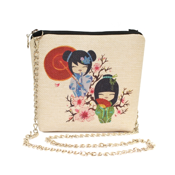 FR0429 Japon Bebekler Baskılı Keten Kare Zincirli Çanta