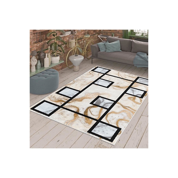 Kaymaz Taban Kare Desenli Siyah Gold 100x140 cm Dijital Baskılı Halı