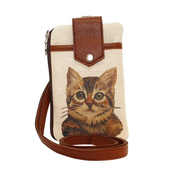 FR1805 Tekir Kedi Baskılı, Deri Aparat, Keten Cep Telefon Çantası