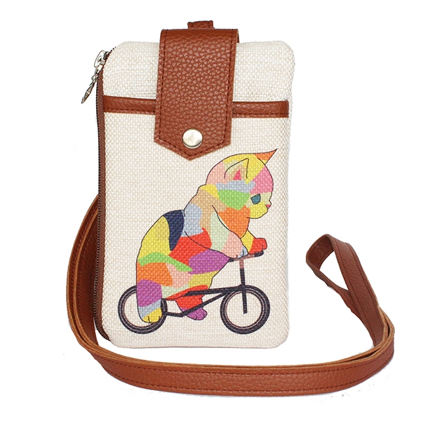FR1834 Bisiklete Binen Kedi Baskılı, Deri Aparat, Keten Telefon Çantası