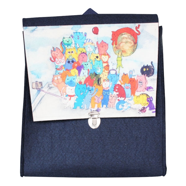FR0911 Selfie Çeken Kediler Baskılı Keçe Sırt Çantası