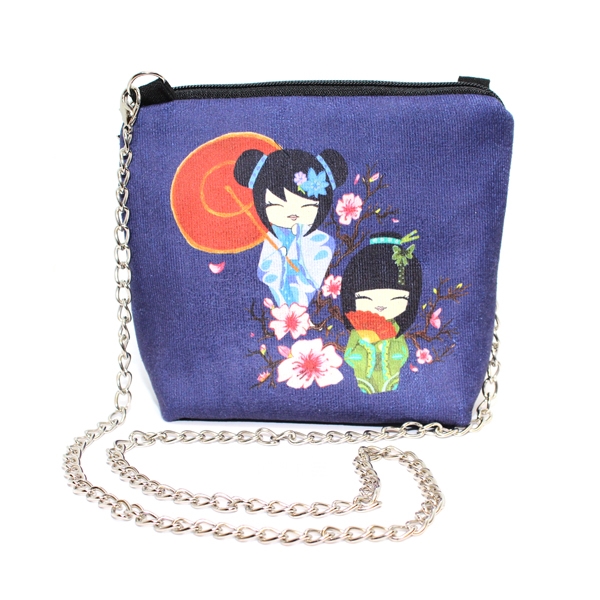 FR0428 Japon Bebekler Baskılı Nubuk Kare Zincirli Çanta